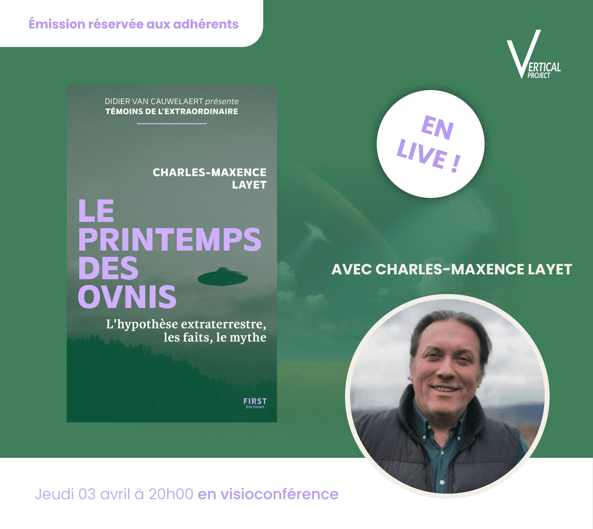 Charles Maxence Layet sera interviewé en live par Jean-Pierre Troadec le 7 Avril 2025 à 20H sur son dernier livre : « Le Printemps des Ovnis » sur Vertical Project Média !