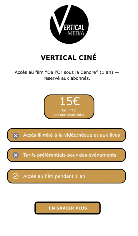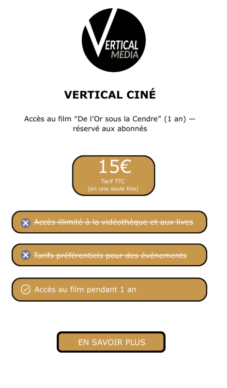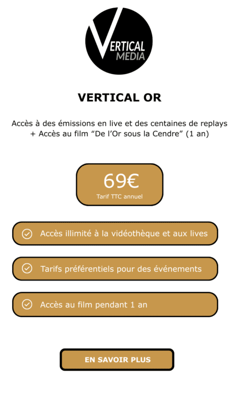 1) Si vous n’êtes pas abonné, on vous propose l’abonnement annuel à VERTICAL MEDIA + film « De l’Or sous la Cendre » — Accès membre (69 € TTC) [Offre Spéciale]
