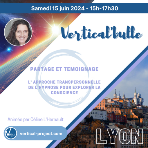 Céline L’Hernault, Hypnothérapeute Transpersonnelle et Coordinatrice des Vertical’bulles, du Vertical Work au sein de Vertical Project Media. Passionnée par le fonctionnement humain biologique et psychique, Céline L’Hernault a commencé par une carrière scientifique en biologie moléculaire dans la recherche sur l’ADN et la Bio-informatique. En 2014, elle a osé le changement vers sa vocation profonde dans l’accompagnement au changement des individus par l‘Hypnose de régression, l’Hypnose Ericksonienne Transpersonnelle et par la Programmation Neuro Linguistique. Elle consulte à Lyon.