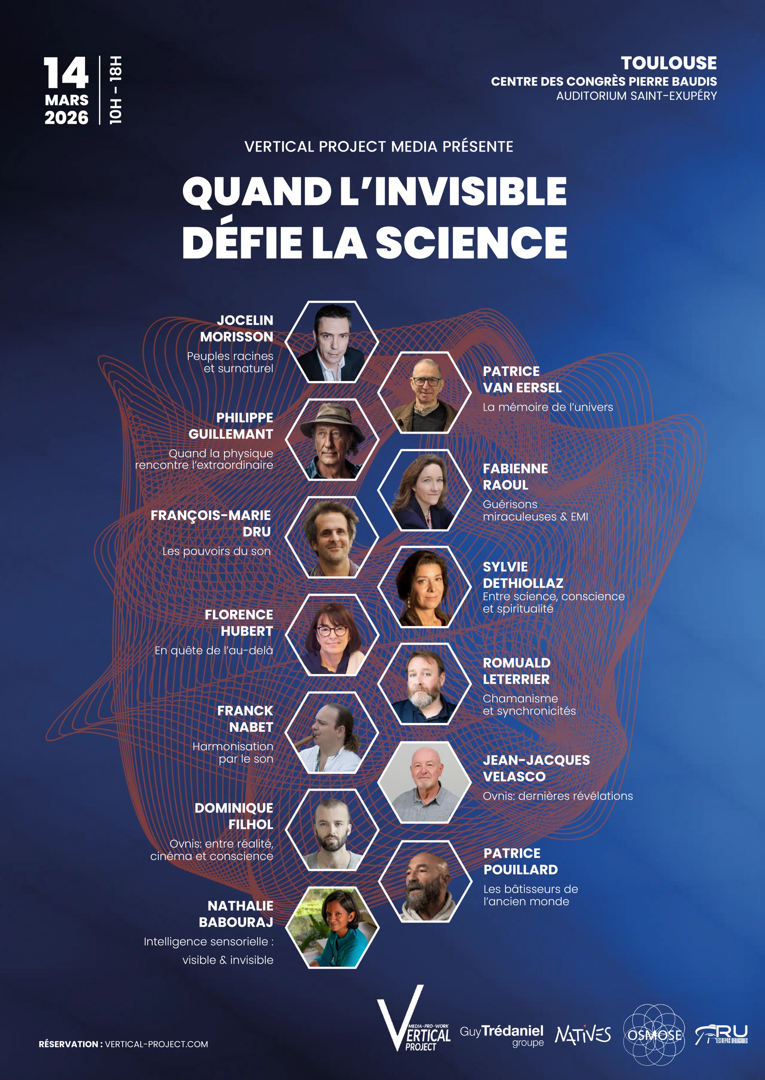 Vertical Project Média vous propose un nouvel événement d’une journée intitulé “Quand l’invisible défie la science”, le samedi 14 Mars 2026 de 10H00 à 18H30 au Centre des Congrès Pierre Baudis de Toulouse (Auditorium Saint Exupéry).