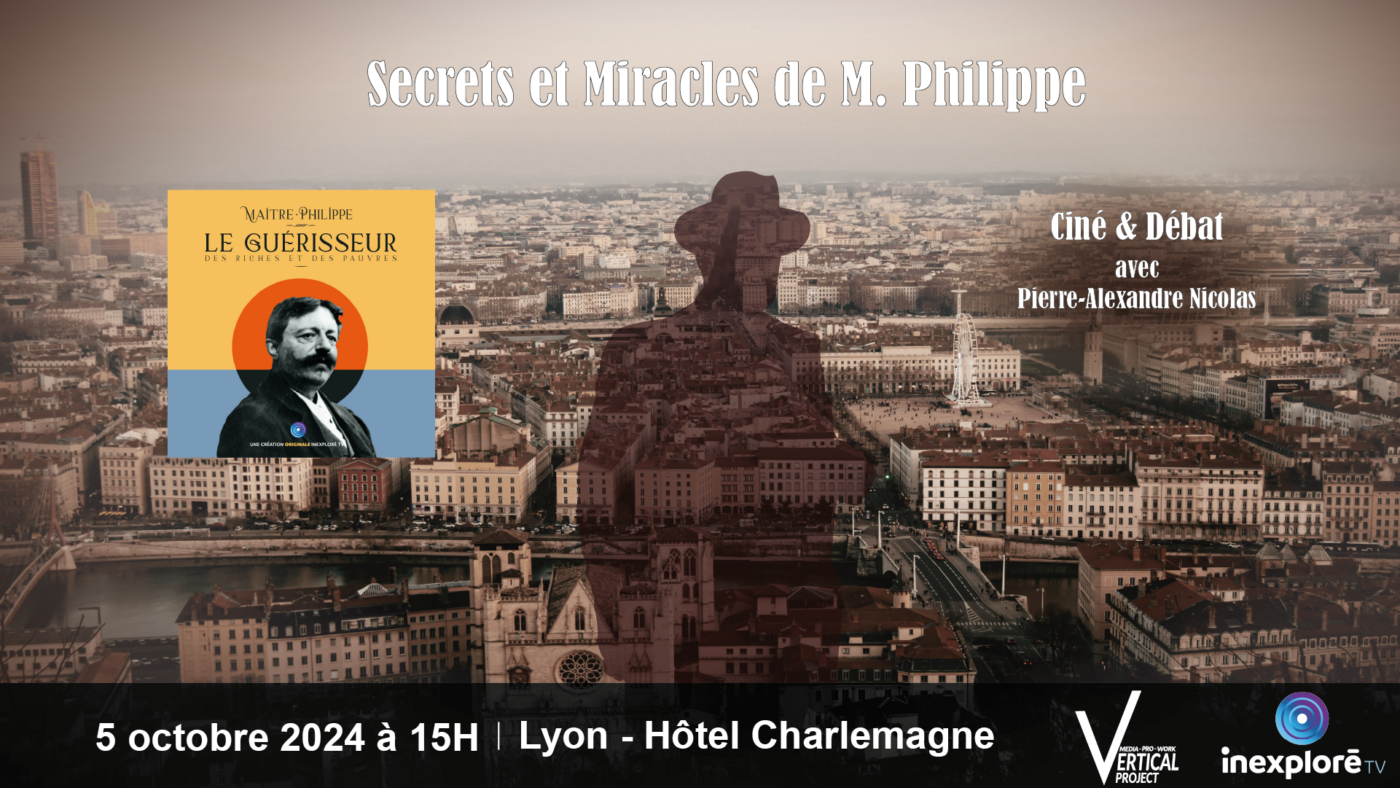 Vertical Project Média, en collaboration avec Inexploré, vous propose un ciné/débat intitulé “Secrets et Miracles de M. Philippe de Lyon” qui aura lieu le samedi 5 octobre 2024 de 15h à 18h, à l’Hôtel Charlemagne (23 Cours Charlemagne, 69002 Lyon).